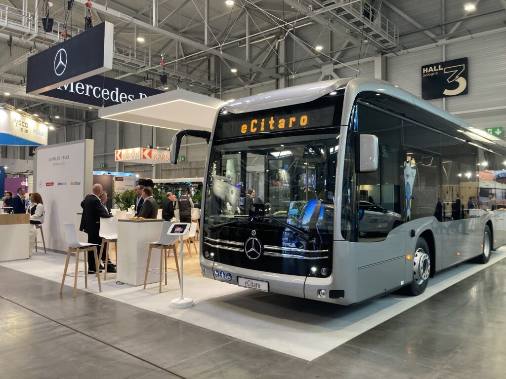 Daimler Buses présentait un des modèles de sa gamme d’autobus électriques eCitaro. Ce bus est proposé en 3 longueurs (10,6, 12 et 18 mètres). Pour la traction, il existe avec des batteries ou bien avec un prolongateur d’autonomie sous forme d’une pile à combustible à hydrogène.