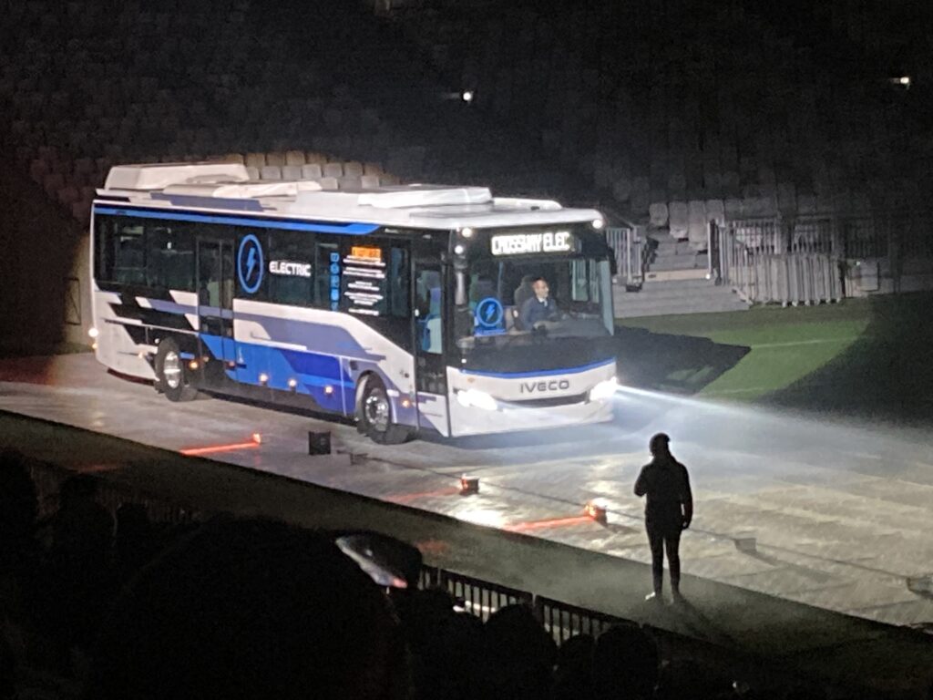 Dans une ambiance festive et conviviale, tous les participants ont, entre autre, pu assister dans le stade à un défilé de véhicules anciens (Chausson ou Saviem S53 par exemple), une cérémonie du souvenir qui s’est clôturée par la mise en lumière du dernier autocar venu de la gamme Iveco Bus : un Crossway ELEC.